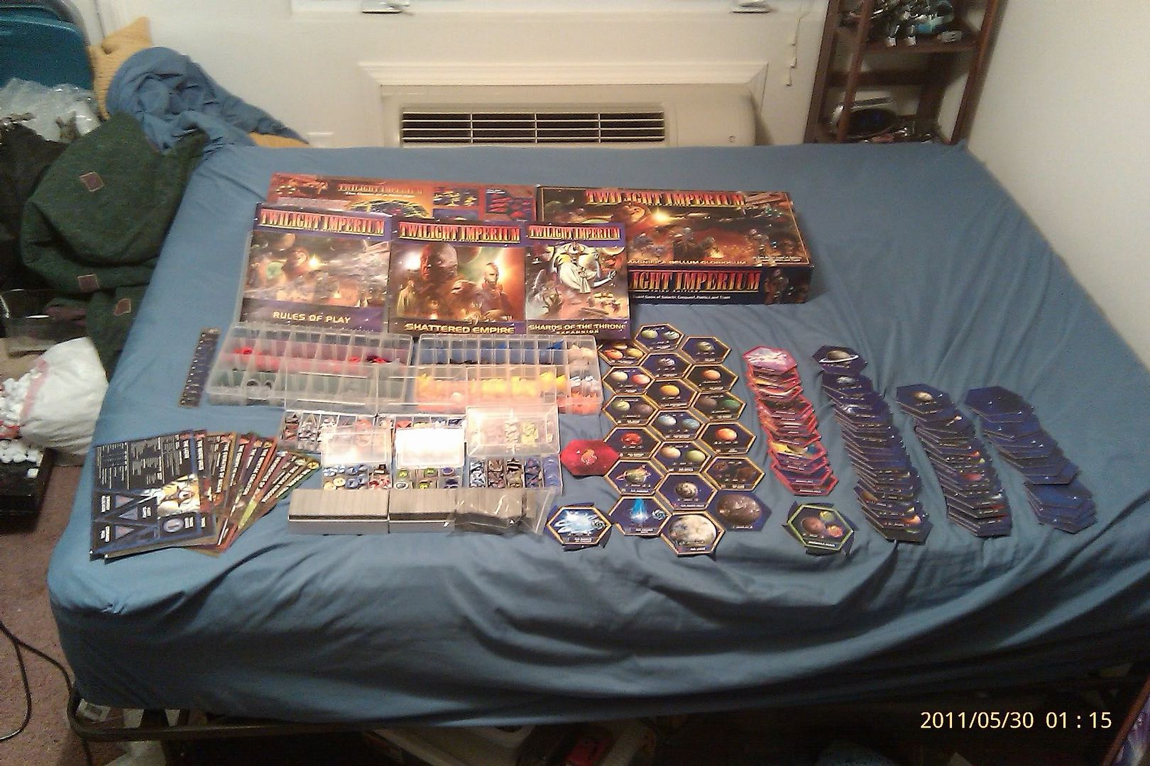 This is a picture of what looks like all the components from the original game and the 2 expansions to Twilight Imperium. This guy, not me at all, has it all very neatly organized, but the organization rested squarely on him. Look at all that stuff!!! Imagine breaking this out every couple weeks to play and not having it organized at all. The hundreds of cards, plastic ships, race tokens, extra ground and fighter tokens, optional rules tokens, systems tiles, and race sheets just thrown into the box. I can imagine that it would be a HUGE pain in the ass to sift through it all for everything each player needs to play. This in turn would make me less likely to play it as it would be just a pain to get everything organized.
